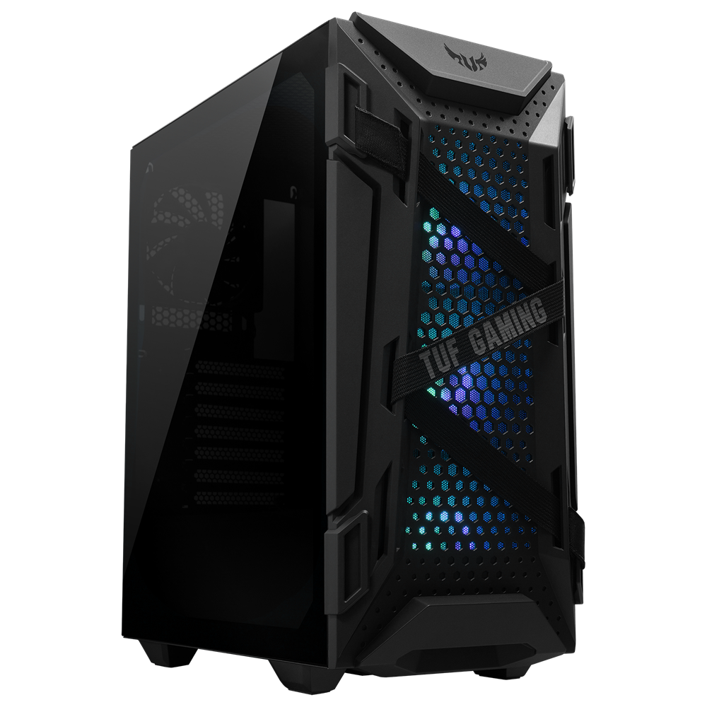 ASUS TUF Gaming GT301 ATX mid-tower compact case with tempered glass side panel, honeycomb front panel, 120mm AURA Addressable RGB fan, VGA holder, headphones hanger and 360mm radiator support.