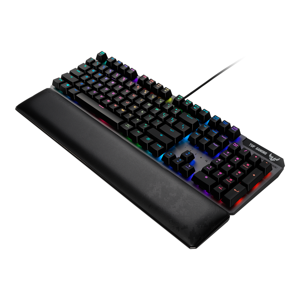 Battlefield domination beckons with the light-speed actuation of TUF Gaming K7's Optical-Mech switches. Choose linear or tactile to match your play style, and exploit the compact design to stay in command. K7 is water and dust resistant, topped with aircraft-grade aluminum, comes with a detachable wrist rest, and has per-key Aura Sync illumination – for a fast and fun way to light up your gaming world.