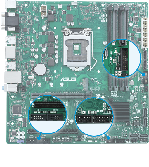 Фиксированное положение разъемовПоложение разъемов на материнских платах ASUS коммерческой серии остается неизменным от поколения к поколению, что облегчает переход от старых моделей к новым.