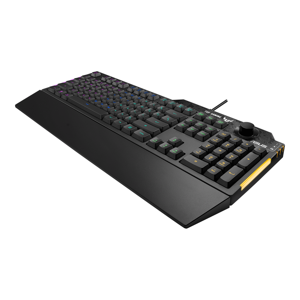 ASUS TUF Gaming K1 is a gaming keyboard that delivers uncompromising performance and exceptional durability. It's equipped with switches that deliver silent tactility with every press. These are housed in a 300 ml spill-resistant frame that's fortified by a specialised coating and validated for tough duty. K1 also features customisable RGB illumination and side-mounted light bars for personalised style, a dedicated volume knob for fast, intuitive control and a detachable ergonomic wrist rest for extended comfort.